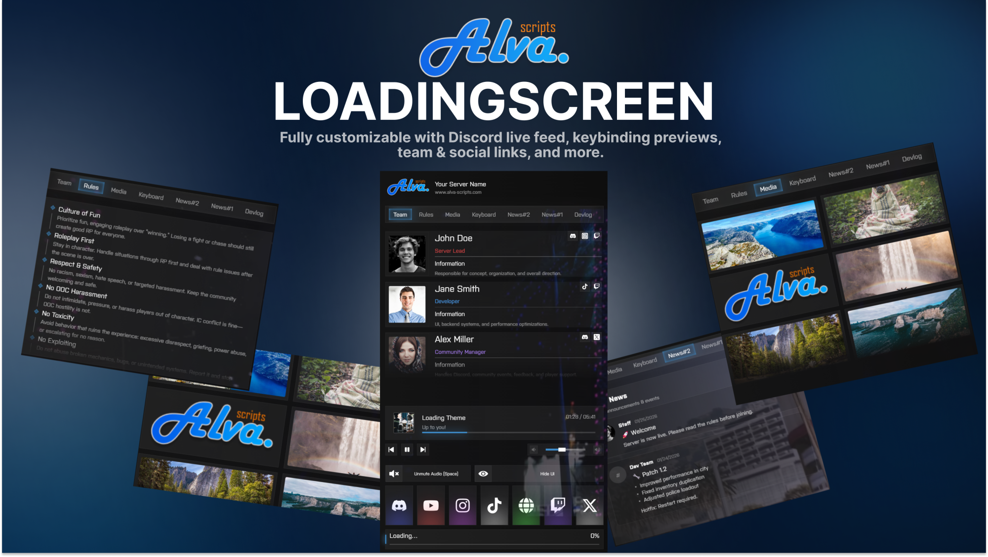 Premium React loading screen with WebM video background, music player, Discord announcement feeds, keyboard shortcuts page, rules/team/media tabs, socials, and full config-driven customization (720p–4K).
