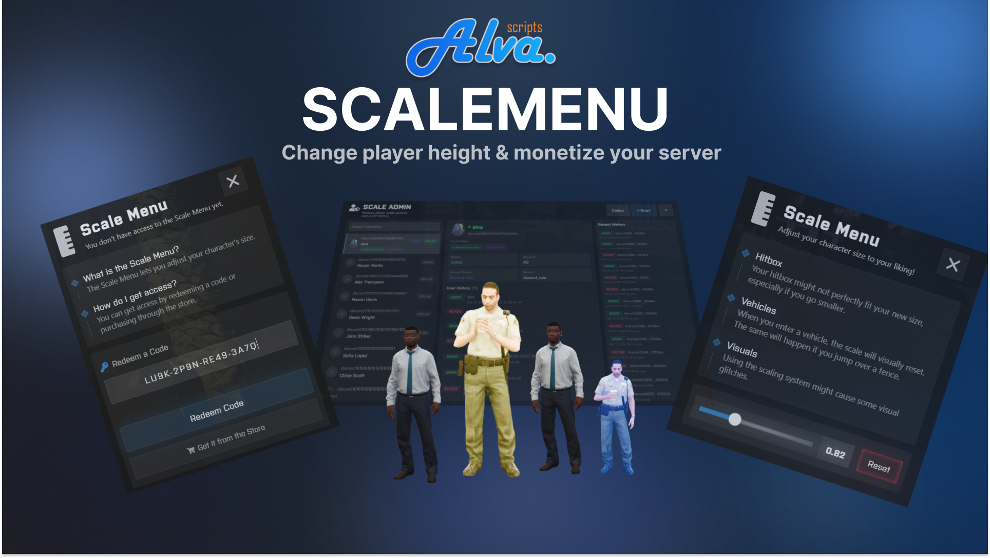 Fully synced Scaling Menu with clean UI, configurable limits, anti-glitch options, optional NPC reactions, flexible access/monetization (DB/codes/items/Discord roles) and an in-game admin panel. Performance focused and fully themeable.