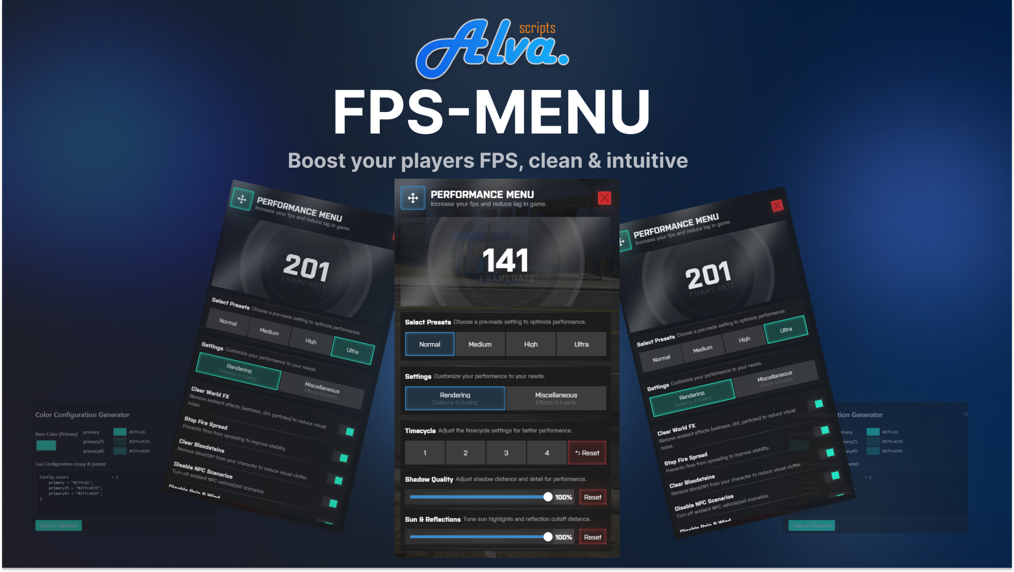 Lightweight client-side FPS optimization menu with presets, advanced rendering/effects toggles, optional FPS overlay and a built-in UI color config generator.