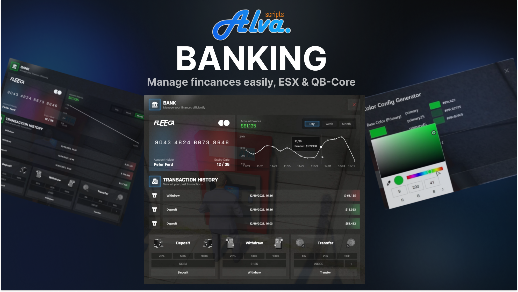 Modern, exploit-safe banking system with React NUI, graphs, full transaction history, framework adapter, ox_target support and in-game UI color picker.